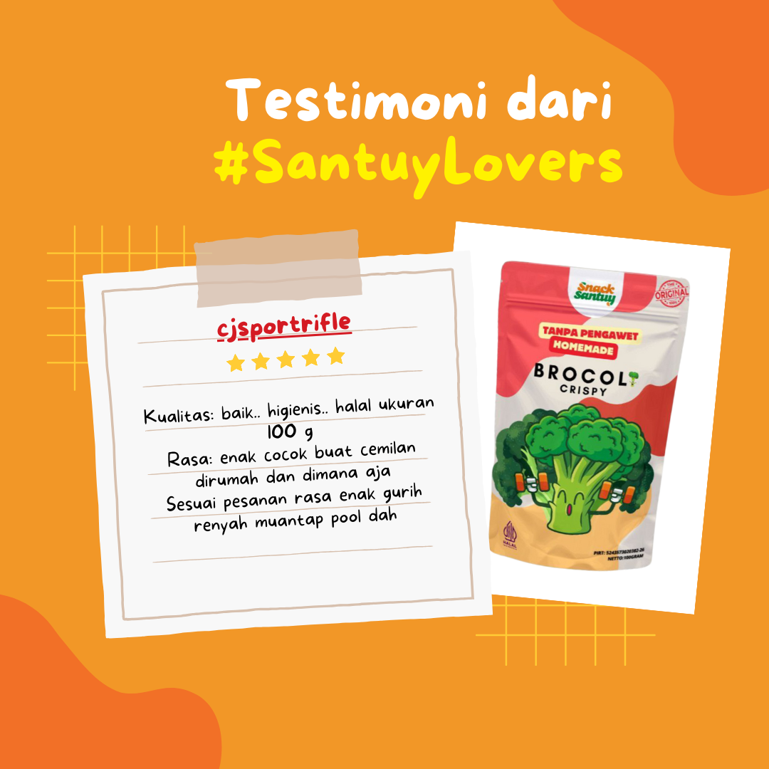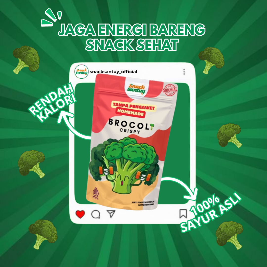 Ngemil sayur jadi lebih seru! Brokoli Crispy Snack Santuy diolah dari brokoli segar pilihan yang dikeringkan hingga renyah tanpa menghilangkan rasa dan nutrisinya. Cocok buat kamu yang pengen ngemil sehat tapi tetap enak. Solusi ngemil sehat yang beda dari biasanya โ sekali coba, pasti repeat.