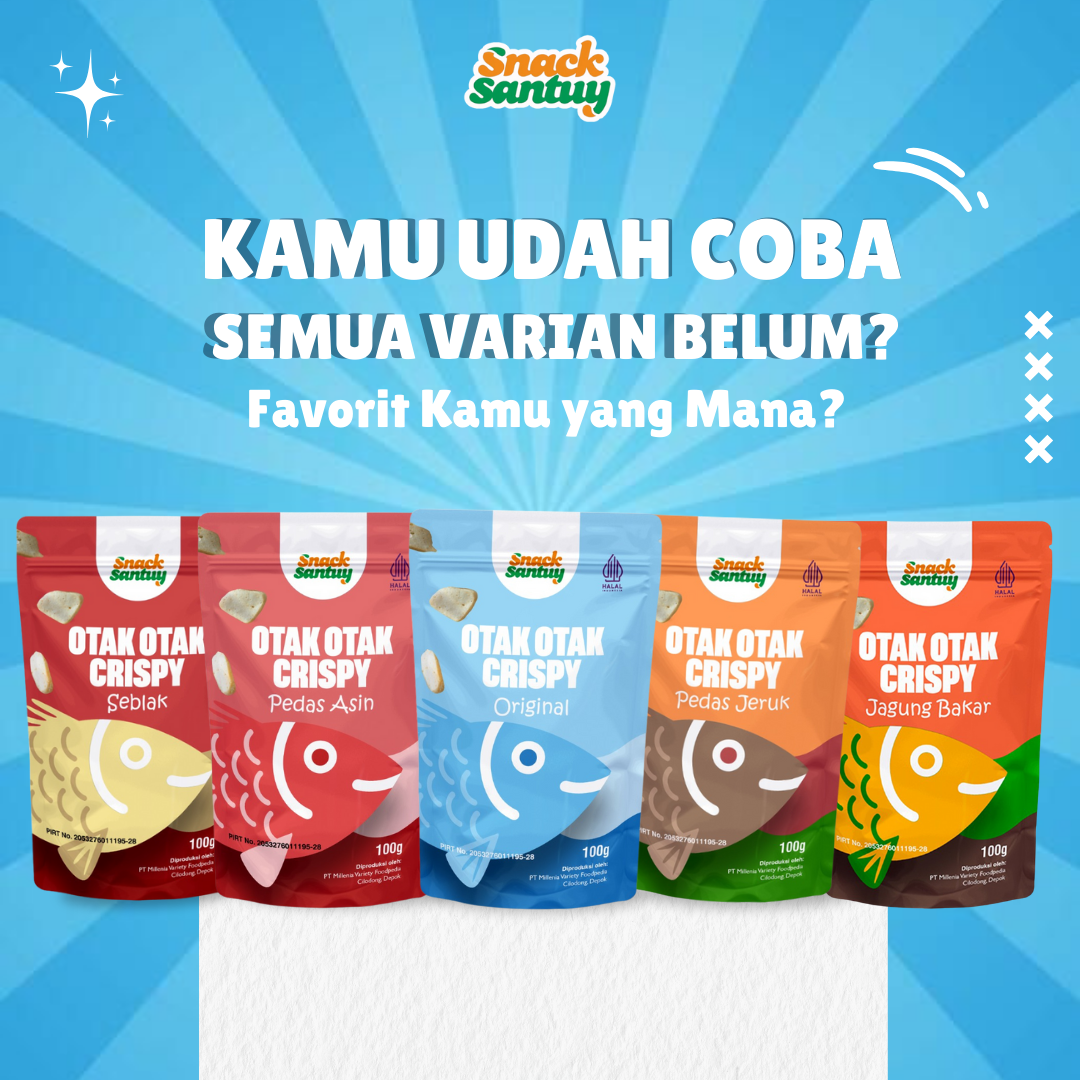 Gurih, renyah, dan penuh rasa di setiap gigitan. Otak Otak Crispy Snack Santuy terbuat dari bahan pilihan dengan rasa ikan yang nikmat dan tekstur renyah yang bikin susah berhenti. Cocok dimakan langsung atau jadi pelengkap makanan favoritmu. Satu produk, banyak rasa โ tinggal pilih sesuai mood kamu.