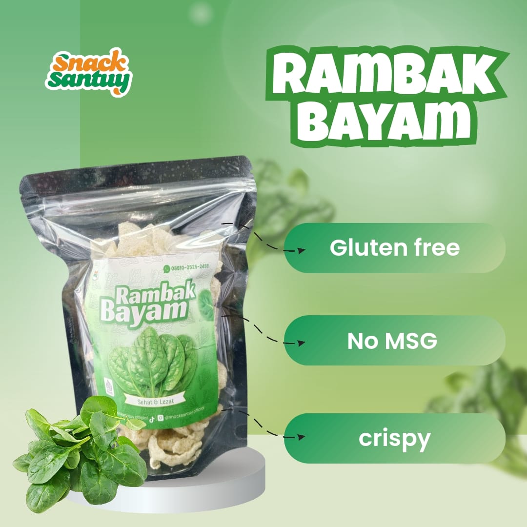 Cemilan sayur yang kriuknya nagih! Rambak Bayam dari Snack Santuy dibuat dari bayam pilihan yang diolah dengan teknik khusus sehingga menghasilkan tekstur super crispy, ringan, dan tidak berminyak. Cocok buat kamu yang pengen ngemil enak tanpa rasa bersalah. Snack sehat yang pas buat teman santai di rumah, kerja, atau kumpul keluarga.